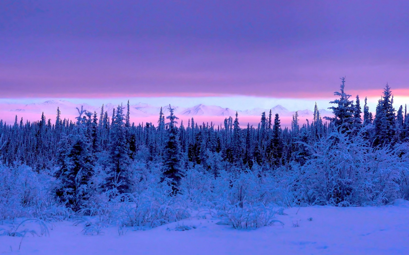Wonderful Snowed Pine Forest and Pink Sunset - 1680x1050