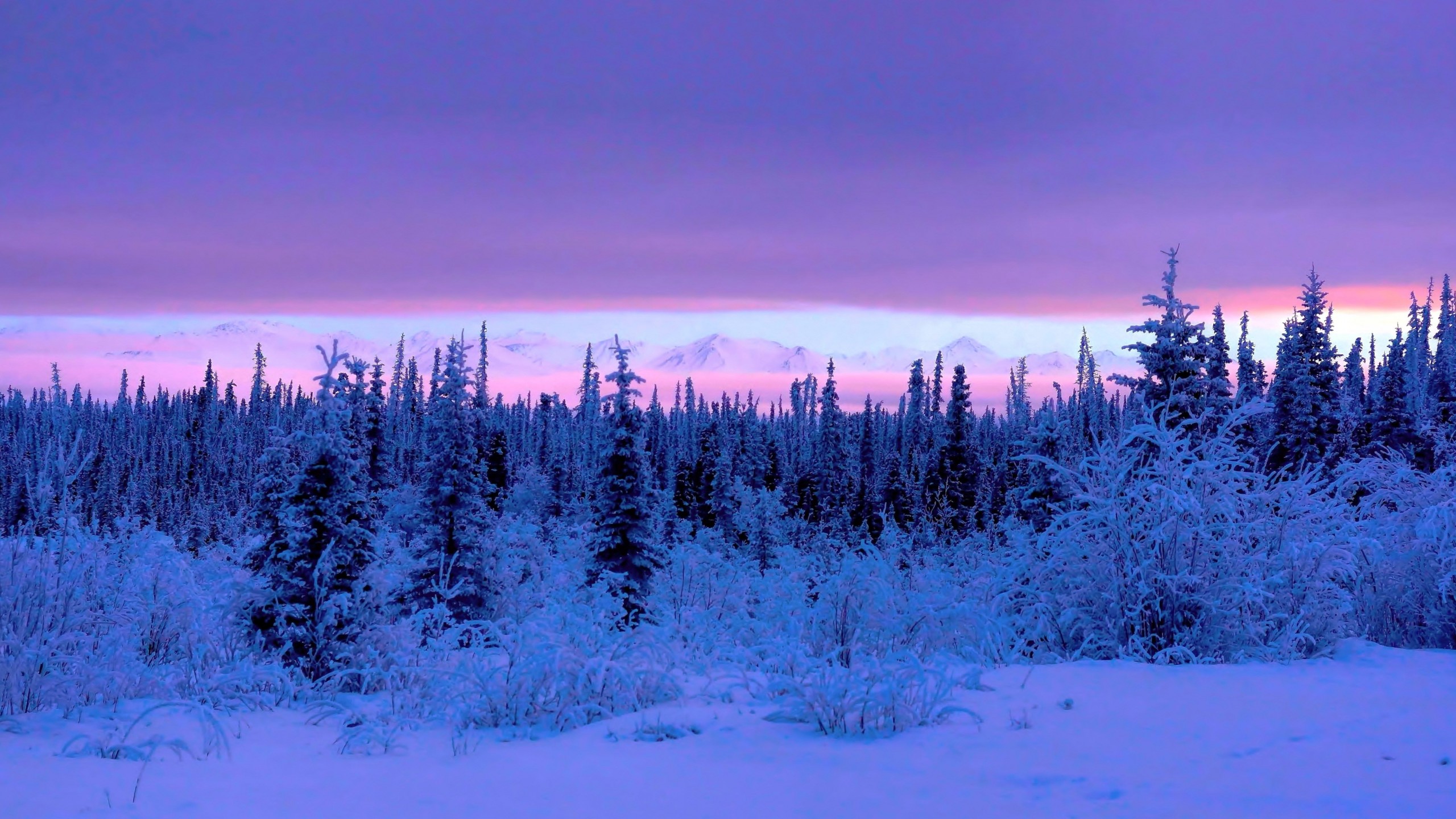 Wonderful Snowed Pine Forest and Pink Sunset - 2560x1440