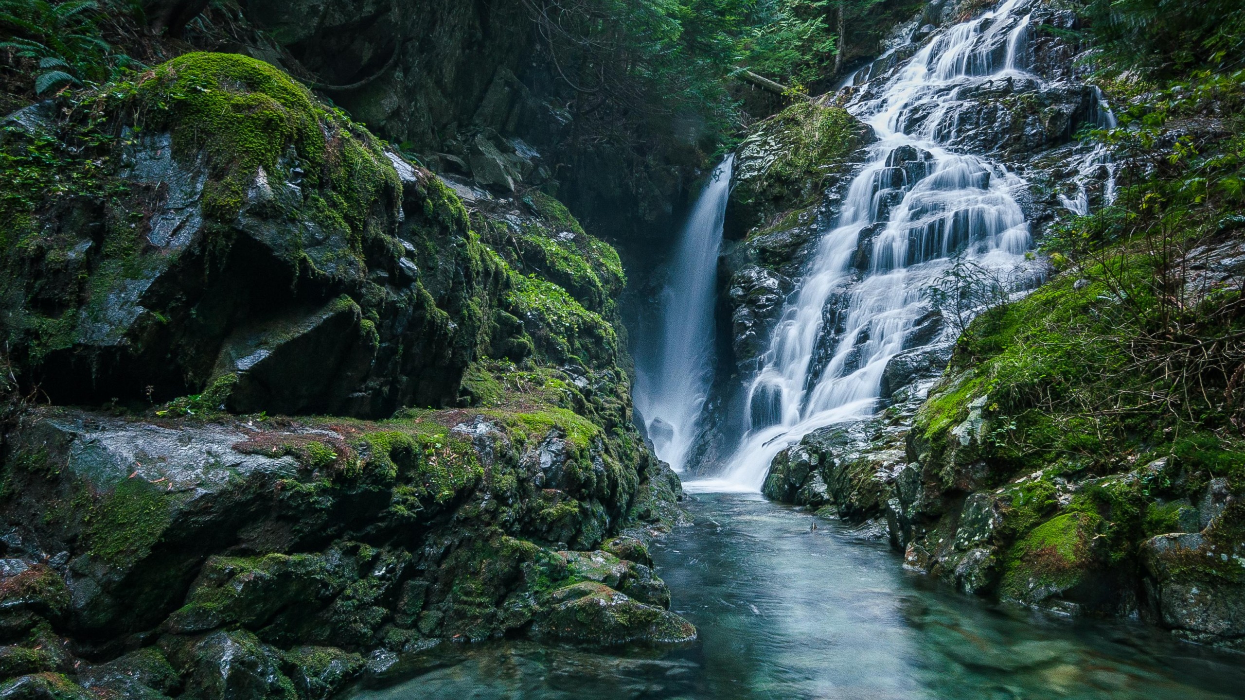 Wonderful Waterfall and Rocks in Green Forest - 2560x1440